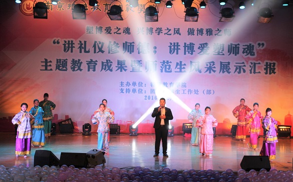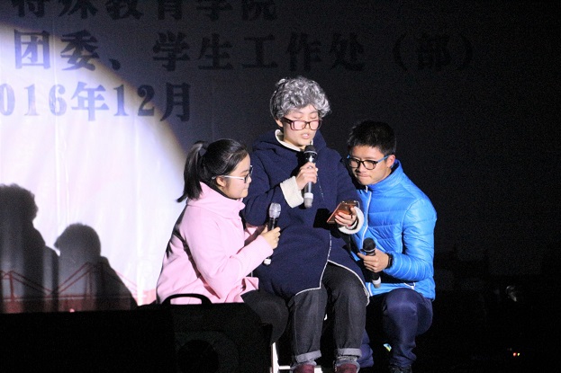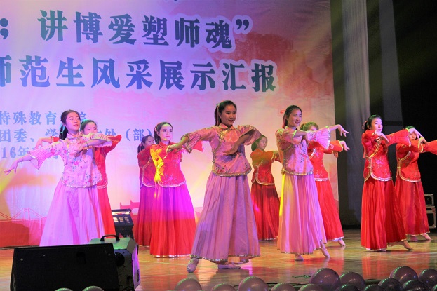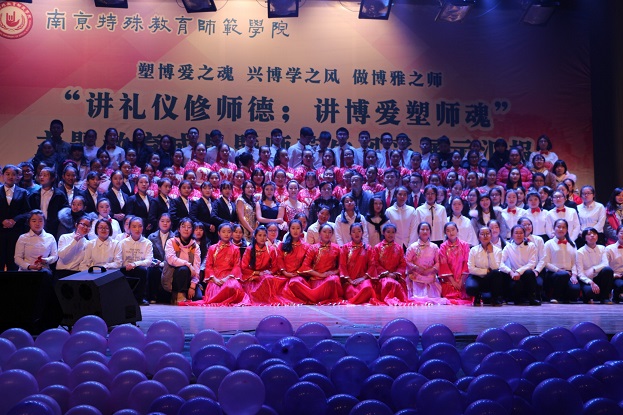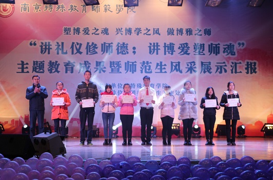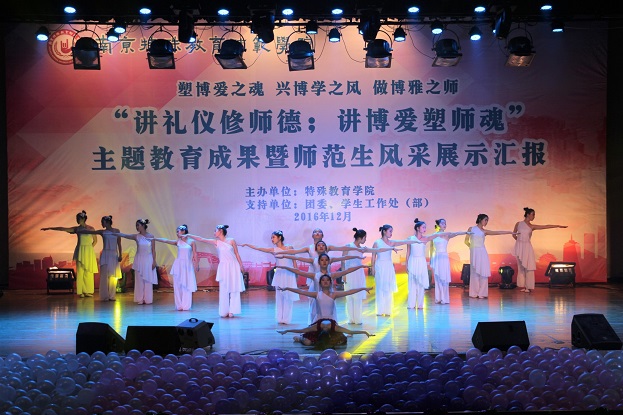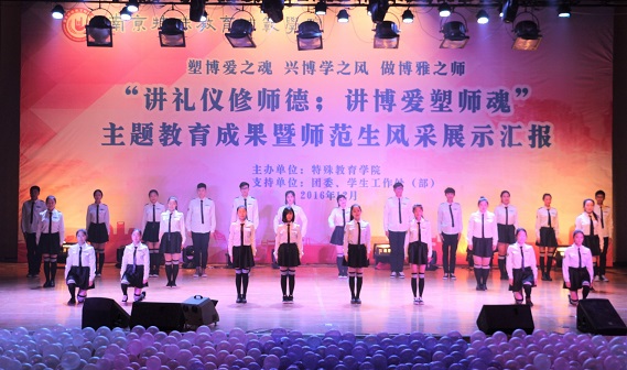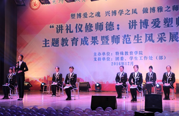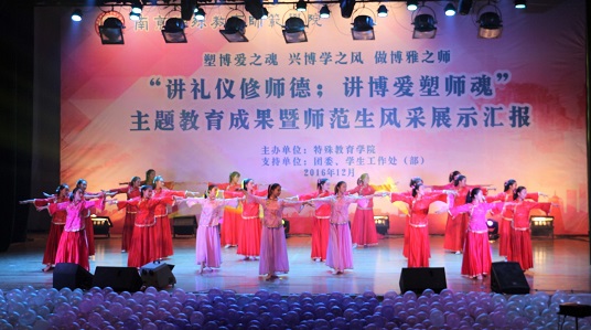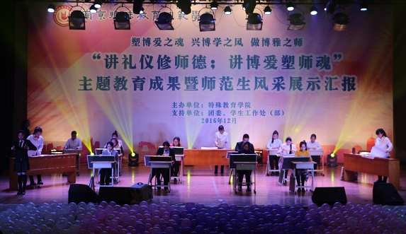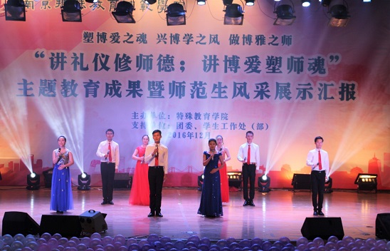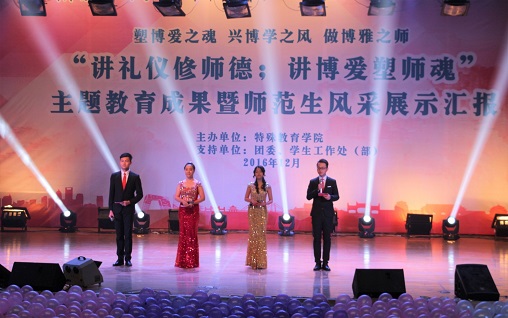 1214日18点整讲礼仪修师德;讲博爱塑师魂主题教育暨师范生技能展示汇报在大学生活动中心隆重举行,校党委书记朱传耿,校党委委员、副校长陈克军,校党委委员、副校长庆祖杰,学院各职能部门领导各院系党总支书记,特教学院党政领导各院系团总支书记/学工办主任、各院系学生代表以及特教学院1000余人一同观看了展示汇报