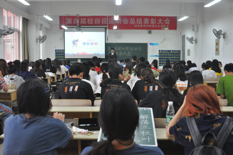 大会伊始,主持人就我院取得的优异成绩进行了汇报,并通过一段视频带领大家在欢乐愉悦的氛围中对运动会进行了回顾。而后,由各团队进行了工作总结。通过对运动员、开场舞、方阵、彩旗队、志愿者队伍、后勤保障、宣传教育等工作内容的详细介绍,并结合一段视频的展示,使大家全面了解在运动会中他们的付出和汗水。他们从前期准备、期间工作、后期总结三个方面进行汇报,用图片和文字带领同学们回忆了运动会那些精彩感动的时刻。会议对表现优异的同学与集体还进行了表彰。