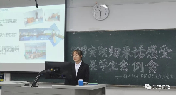 接下来是由来自优才计划的王智鹏上台进行分享。他首先给同学们播放了一段视频,使同学们更加全方面的了解了他们的实践内容。优才计划的团队成员们走进社会群体,传递博爱社会情,以认真踏实的态度赢得了老师和家长的一致好评。在此次实践中每位学员不仅收获颇多,而且他们更加深刻的理解了特殊教育的内涵和意义。之后进行分享的是博爱社,汇报人尤璇,她用一个简单且温馨的小视频,为我们真实再现了博爱社暑期社会实践的情景,并从项目基本概述、完成经过、项目成果、社会效益四个方面做了详细介绍。他们通过“一对一”的教学模式,因材施教,提高了儿童的适应能力,鼓励他们与人交流互动,使其能更快融入社会生活。最后为我们汇报的是守望星星小分队,汇报人禤姝颖分别从实施项目介绍、项目过程、成果展示、未来计划展望4个方面进行了阐述。为了发挥每个成员的优势,他们制定了“一人一课程”的教学方法,使教学水平得到了提高。在老师们的帮助之下,此次实践使他们增长了自己的见识,丰富了自己的认知。在未来,他们要将守望星星的理念、自闭症儿童相关内容以及更多特教知识传递给更多的人。