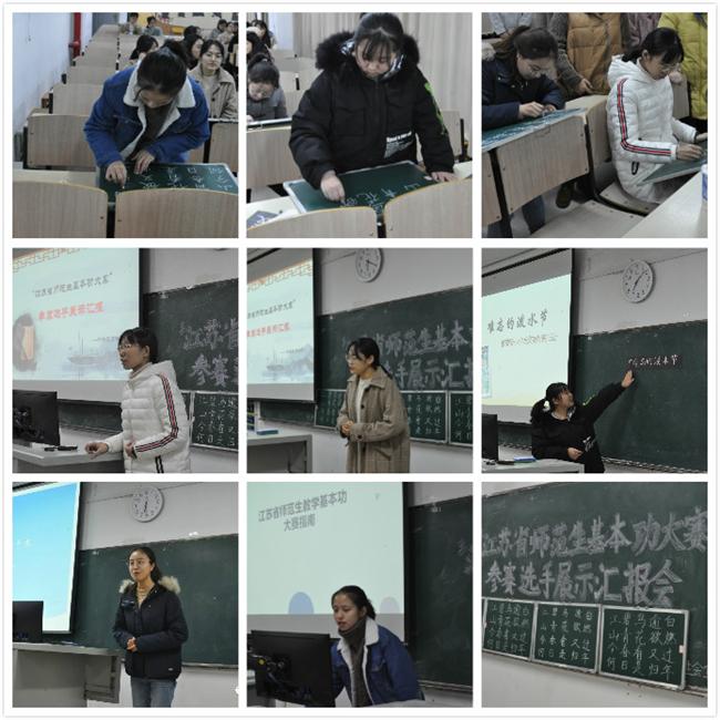 首先第一个环节,为了更好地宣传本次大赛,吸引更多优秀的同学参加到师范生的选拔工作中来,16级小教专业卢欣荣同学全面而详实地介绍了江苏省师范生基本功大赛的赛程、比赛办法和评分规则,通过介绍,在座的同学们对大赛有了深入而全面的了解。接着,六位参赛归来的选手现场展示八分钟的粉笔字和钢笔字。她们的字迹规整、方正优美、刚劲有力,充分展示了我院学子扎实的师范生基本功和勤学苦练的优秀品质。