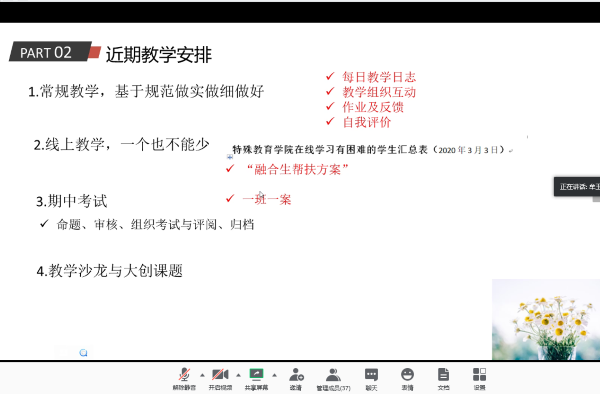 接着牟玉杰副院长就近期的教学工作进行了布置,包括:当前线上教学存在的问题与改进意见,教学基本规范、期中考试、教学沙龙与大创课题、融合教育管理等,重点强调了要进一步加强毕业论文指导工作。