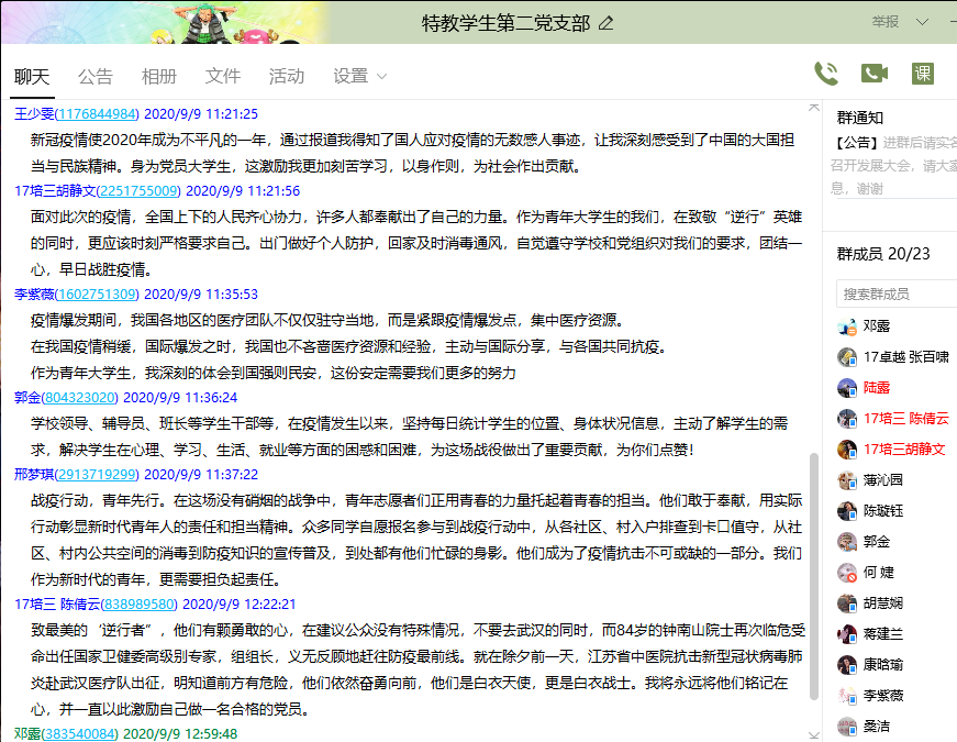 本次微党课的内容丰富,学生支部师生党员均表示收获满满,纷纷向全国各地战“疫”的英雄们致敬,并表态坚决听党指挥,做有志青年,勇于担当,敢于奋斗。新学期开学返校后,更要用实际行动,积极配合学校做好各项防疫工作,勤奋学习,充分发挥党员的先锋模范作用,为学院的高质量发展和校园安全稳定贡献自己的力量。(文/邓露)