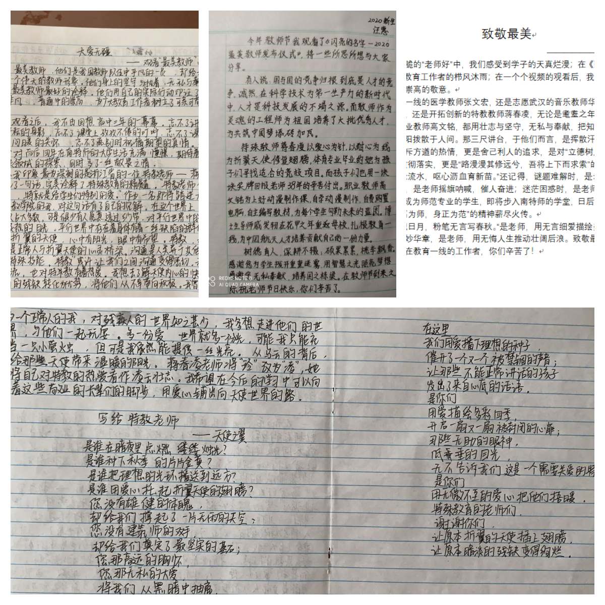 观看完发布仪式,我院2020级的新生纷纷抒发感想,表达对教育事业的热爱和立志成为一名优秀特教老师的决心。新生罗佳佳同学说,“在今年,我有幸成为师范专业的学生,即将步入南京特师的学堂,日后必将踏实勤奋,谨遵老师教诲,将‘学高为师,身正为范’的精神薪火相传”;新生丁文珺看了发布仪式后,受到蒋春凌老师的鼓舞,更加坚定了对特殊教育的热爱,她说,“我想去了解折翼天使们的内心,我想走近他们的世界。我想从乌云背后,给那些折翼天使带去温暖和阳光”;新生杨帆说,“看着看着,潸然泪下,我对教师这个职业有了更深刻的认识和更高的敬意。作为一名师范专业的学生,我更加明确了教师所肩负的社会责任。在这个特殊的节日里,我向所有平凡而伟大的教师致敬,以最美教师为榜样,努力成为一名优秀的教师!”