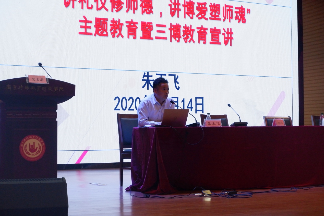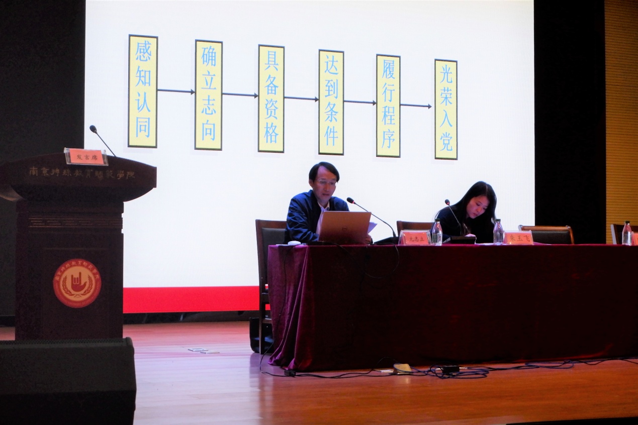 最后,党总支书记叶亮做政治导航。叶书记详细介绍了学生入党的基本要求和发展程序,带领同学们学习了解入党誓词,要求端正入党动机,积极向党组织靠拢。党总支副书记朱玉飞做题为“讲礼仪修师德、讲博爱塑师魂”的主题教育暨三博教育宣讲动员,对我院的三博教育品牌活动进行了详细介绍和宣传。