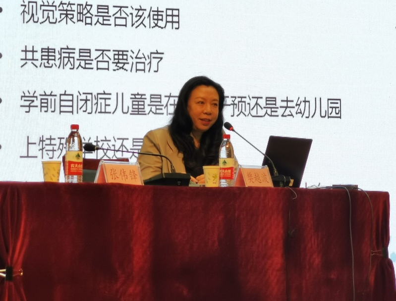 在讲座中,樊越波主任指出我国自闭症儿童在特殊人群当中占比很高。作为特殊教育工作者,我们必须要多了解适用于自闭症儿童的循证干预方式及发展方向。她从“干预与支持框架”、“干预方法”和“质疑与预测”三个方面展开阐述,带领同学们深入认识自闭症儿童及干预。