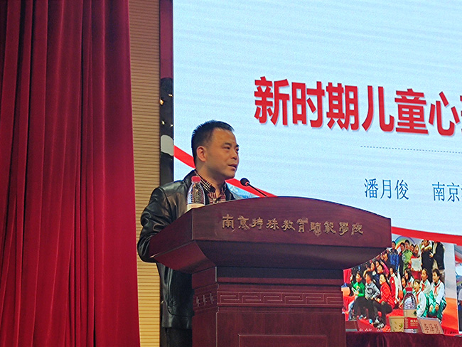 主持人李老师介绍,潘月俊主任是南京市心理学科教学带头人,苏科版《心理健康教育》教材(小学)主编,发表相关文章近百篇,出版著作二十余部,现任南京市江北新区特殊教育指导中心办公室主任,江苏省心理学会学校心理专业委员会副主任委员。