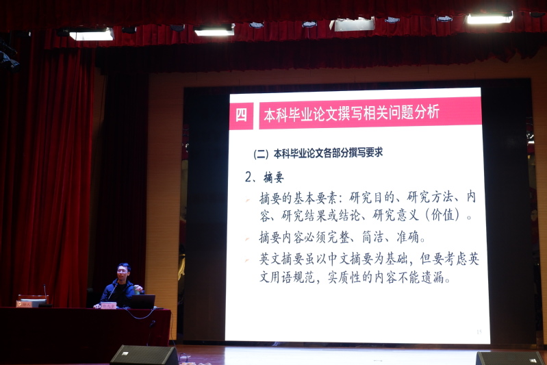 在本科毕业论文撰写相关问题上,向同学们介绍了本科毕业论文构成要素,并提出了毕业论文各部分撰写的要求:题目简洁鲜明,问题意识强;摘要用简单明确语言介绍研究目的、方法及内容,切忌空泛;关键词是属于一种价值词汇,可以选取题目或文章中的核心词汇,遵循专业性原则;正文要各级标题明确、逻辑清晰、主题突出、文字流畅、参考文献要遵循文献著录格式。