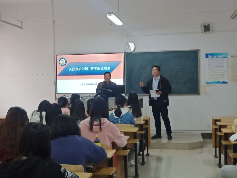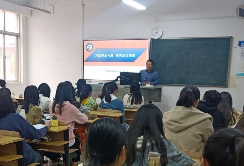 讲座围绕“关注课后习题落实语文要素”这一主题展开。讲座一开始,孟老师就分享了他作为教师资格证面试主考官面试过后的感想,直接点出了同学们模拟授课过于模式化的通病,由此引导同学们关注教材的课后习题,结合课程标准、教学目标,抓住教学重点。以课文《搭船的鸟》为例,整体把握、比较阅读、聚焦重点、以读促思。关于课堂教学,孟老师给出了自己的建议:要教给学生看得见的方法,带不走的能力。讲座过程中,现场气氛轻松活泼,讲座内容丰富多彩,孟老师语言幽默且具有哲理。