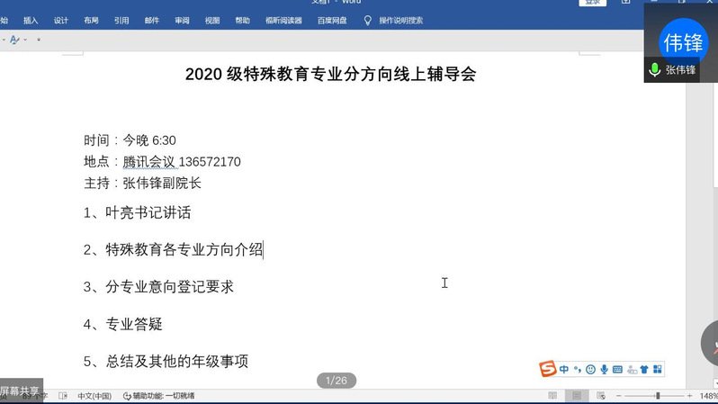 5月21日下午,永利yl23411集团举办2020级特殊教育专业分方向线上辅导会。会议由学院副院长张伟锋主持,学院党总支书记叶亮、学院专任教师石晓辉、教务员孙辰以及20级辅导员元志立等老师出席,2020级266名特殊教育专业学生全部参加。