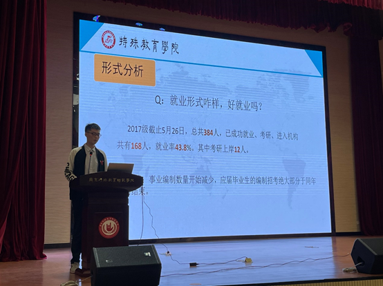 接下来由受邀的6位不同专业方向的17级成功考编的同学,为大家分享考试经验以及备考指导。6位同学从不同的备考专业方向出发,有特殊教育方向的考编、小学教育文科方向的考编、小学教育理科方向的考编、手语翻译方向的考编等,为大家带来全方位、不同维度的考编经验分享。内容包括从考试初始的选择与思考,到笔试的准备,再到面试的准备。每位同学都给大家带来了自己的“葵花宝典”,他们充分挖掘线上和线下的资源,搜集整理常用的公众号、知乎答主、微博博主以及b站up主等优秀的线上资源,同时也分享了用于考编的各种纸质材料。他们的分享真情实意,大家在分享中收获颇多。会议开始之前,由王赫煊老师汇报之前对大家就业意向的摸底调查情况,指出我院大部分学生未来的就业方向在考编。随后,王老师指出本次活动旨在为大家厘清未来的就业方向,并建议大家在当下及时做好准备,将计划做在前头,以充分的准备去迎接未来的各项挑战。