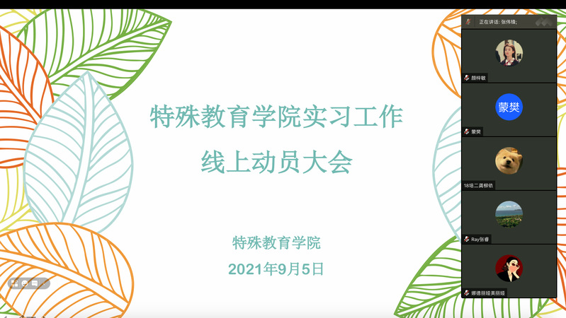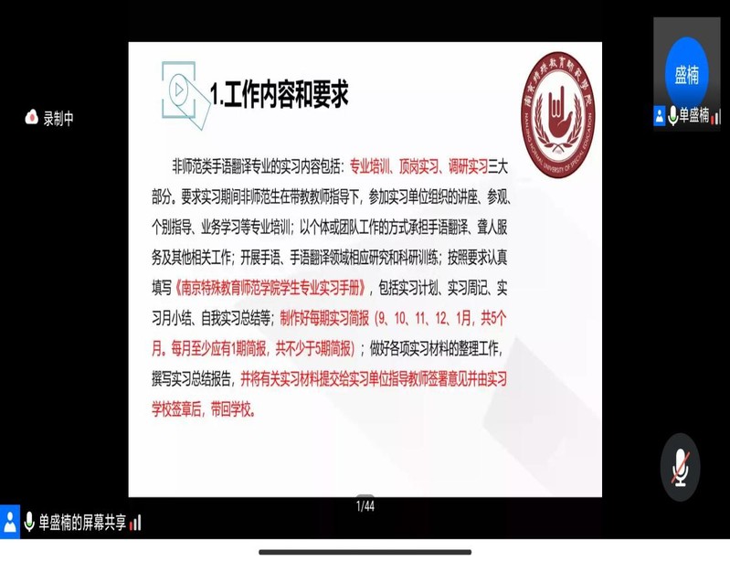 单盛楠老师解读永利yl23411集团2018级本科生专业实习工作方案。单老师对学院实习工作方案的重点内容和要求以及线上实习工作的有关安排做了详细说明,从实习生的视角明确了特教、小教和手翻专业学生的实习内容和要求、日程安排、实习生管理与服务事务、成绩评定等内容,确保各专业的实习工作能按照方案有质量地如期完成。单老师还重点介绍了学院线上实习工作的安排,包括实习生动员大会,线上专题讲座,居家模拟教学、教学方案设计,教案研讨和修改等。