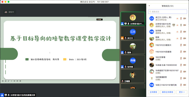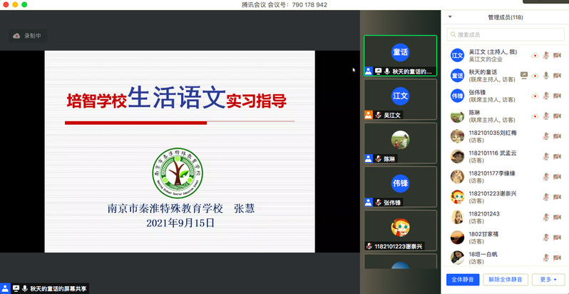 9月15日下午,秦淮区特殊教育学校张慧校长的培智学校生活语文实习指导线上讲座顺利开展,由特殊教育系主任陈琳主持。张校长以介绍自身特教经历和情怀开场,奠定了本讲座专业又温馨的基调。张校长主要阐述对生活语文课程的认识、教学设计、实习注意事项三个方面。关于生活语文课程,张校长介绍了它的发展历程、定位、功能、核心理念、总目标和各个学习领域目标,强调在生活语文教学中倡导感知、体验、参与的学习方式。关于教学设计,张校长从智障学生学习生活语文的特点、个别化教学、教学基本原则、教学基本要求、“五有特征”、四个核心问题等方面详细说明,并给出相应教学建议。张校长还分享了两份详实的生活语文教学活动设计,并带着学生进行内容版块分析。最后,张校长提出了五点实习的注意事项,期许实习生们树立正确的认识,保持足够重视、提前做好准备和给予爱。