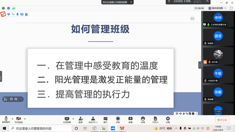 9月4日晚上,南京市数学学科带头人王翠的线上实习讲座顺利开展,由小学教育系主任赵文超老师主持。王翠老师在讲座中主要围绕如何进行教学设计、管理班级、与人处事等方面展开,结合自身的经历与实践,为大家分享了她多年的一线教学经验。关于小学数学的教学设计,王老师着重强调在备课时要注意回到原点——重新审视教材,并与同学们分享了备课的四大技巧。在管理班级方面,王老师指出三点:要让学生感受教育的温度、要用阳光管理激发学生的正能量、要提高管理的执行力。在与人处事方面,王老师重点强调,在吃苦耐劳中绽放,即肯做事、会做事,努力完成、做好每一件交办到自己手中的事情。讲座结束前,同学们的积极提问,王老师耐心解答,本次讲座在愉悦的互动中结束。