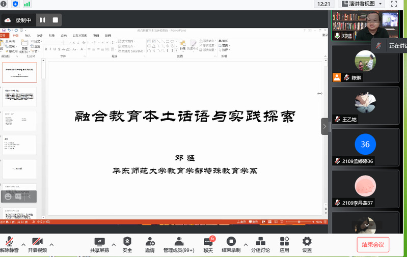 特殊教育系邀请了华东师范大学教育学部特殊教育学系博士生导师邓猛教授,讲座主题是《融合教育本土话语与实践探索。邓猛教授借用朴永馨(1988)先生的先见之言“没有任何一个外国可以为解决中国几百万残疾儿童教育准备好现成的药方,我国特殊教育的发展模式必须建立在我国特有的国情与文化传统之上,对西方的文化传统、教育哲学等应该采取拿来主义的态度,不能照搬。”进而围绕着融合教育的话语体系以及本土特色、理论构建进行了详细的阐释。