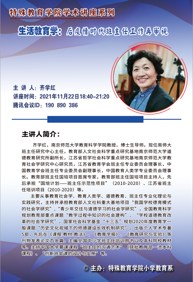 1122日晚,小学教育系学术讲座系列活动继续开展。本次讲座特邀南京师范大学教育科学学院博士生导师齐学红教授在线授课,讲座专题为《生活教育学:后疫情时代班主任工作再审视》。
