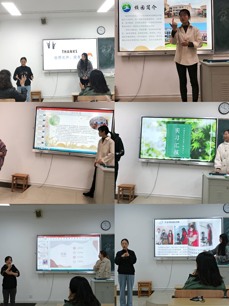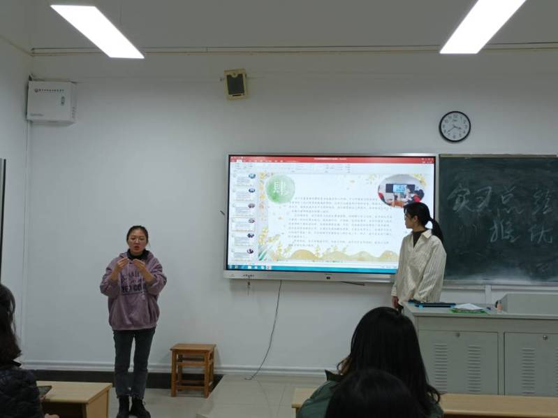 活动的第二项内容是三名实习生的个人精彩汇报。第一名同学从教学和翻译两方面汇报自己的实习工作,介绍自己的工作情况以及遇到的困难及解决过程,最后还和大家分享自己的收获体会。第二名同学在实习期间,去过学校做翻译,也曾前往医院帮助聋人就医,即使受疫情影响也可以通过线上平台帮助聋人进行社会交流。还分享了在手语翻译实践过程中应该注意的细节,丰富的实习经历让同学们感叹。第三名同学,因受邀留在实习学校担任代课老师,她专门拍摄了一段视频进行实习汇报,将自己的实习经历与所思所想很好的传达给大家。