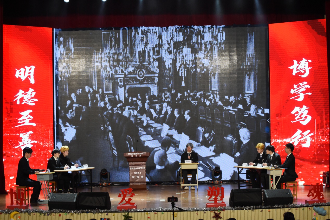 “崇德”篇,首先由音乐与舞蹈学院带来歌舞《映山红》。在中华民族谋求独立、人民谋求解放的岁月中,红军带领人民打土豪分田地,鲜艳的映山红开满了山坡。而今迈入新时代,一首激情澎湃的《映山红》带我们重回当年,再现军民鱼水情。随后是由语言学院带来的情景剧《巴黎和会》。“弱国无外交,落后就要挨打”这句话时刻警示着同学们,要努力学习,为实现中华民族伟大复兴贡献力量。第三个节目是由管理学院带来的朗诵《以先辈之烈魂,筑己代之风貌》。“山因脊而雄,屋因梁而固”,英烈是中华民族的脊梁。中华民族经历从站起来、富起来到强起来的过程,浸染着无数革命先烈的铁血荣光。