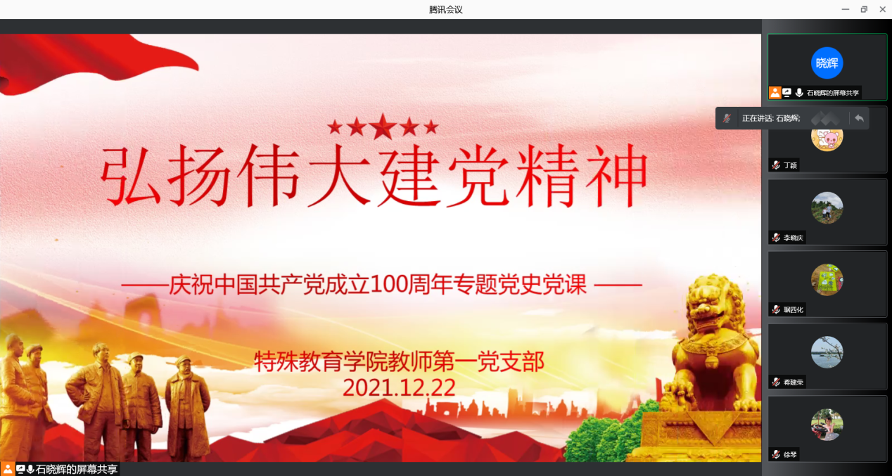 最后支部书记谈了伟大建党精神对当前工作的启示。“坚持真理坚守理想”要求党员认真学习习近平新时代中国特色社会主义思想这一当代中国马克思主义,并落实于本职工作中,坚定发展我国特殊教育的职业理想。“践行初心担当使命”要求党员教师坚守育人初心,在课内外关心学生,服务学生的全面发展。“乐于奉献勇于担当”要求党员在当前学校各项办学水平评估和项目申报中勇挑重担,勇创佳绩。“对党忠诚不负人民”要求党员教师坚定为党育才,为国育人的使命,团结带领身边其他同志一起为学院事业发展,为我国特殊教育事业进步贡献力量。