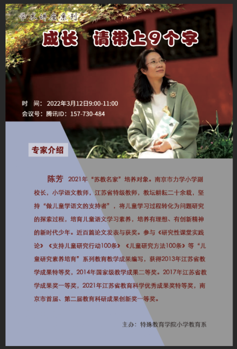为拓展学生视野、促进学生专业发展,2022年3月12日上午,小学教育系特邀2021年苏教名家培养对象、语文特级教师、南京市力学小学副校长陈芳老师在线讲座,讲座专题为《成长,请带上9个字》。
