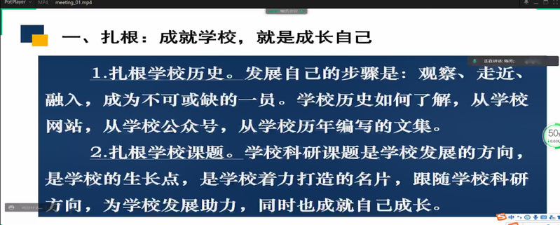 陈校长首先针对新入职教师如何适应新的工作岗位、适应教育教学工作这一问题,提出了“扎根”学校、成就学校就是成长自己的观点。随后结合自己的四个成长故事及学校的课题项目,指出青年教师要扎根学校历史、扎根学校课题。