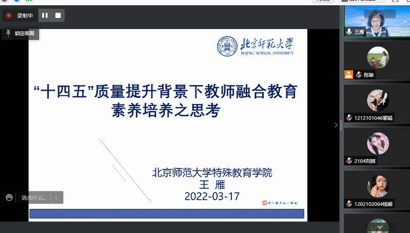 王雁教授通过两个小时的线上讲授,让同学们对融合教育、融合教育教师的素养、“十四五”特殊教育发展提升行动计划等内容有了更深入的了解,对今后的工作方向和生涯发展计划有了更多系统思考。讲座后我院师生也就相关问题与王教授进行了积极的讨论互动,取得了非常好的学习效果。(文、图/陈琳 编辑/徐琴 审核/李拉)