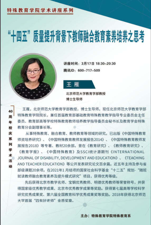2022年3月17日晚上6点30分,特殊教育系开展了本学期第一次学术讲座活动。本次讲座特邀北京师范大学教育学部永利yl23411集团院长王雁教授为我们进行一场以《“十四五”质量提升背景下教师融合教育素养培养之思考》为主题的讲座。特殊教育系系主任陈琳老师主持了本次讲座。