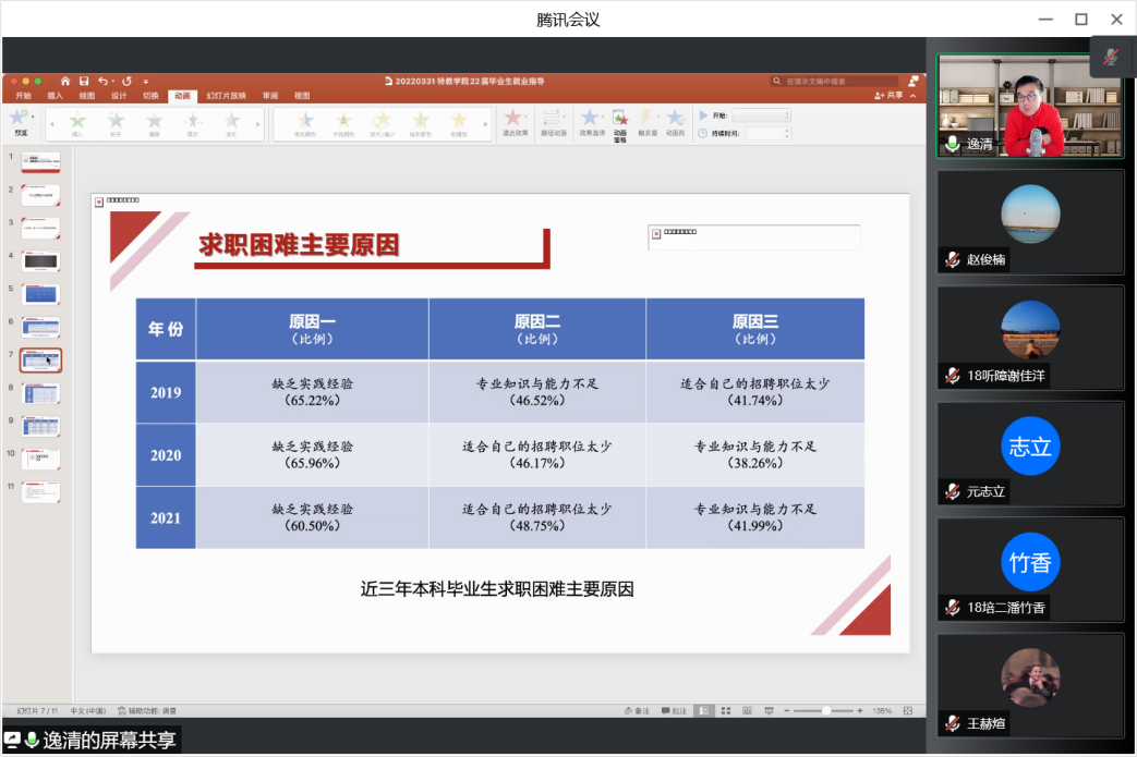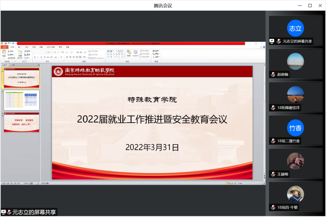 为进一步了解当前就业形势政策,促进疫情期间顺利开展毕业班就业工作,永利yl23411集团于3月31日晚在线召开2022届就业工作推进暨安全教育会议。学院党总支书记叶亮、副书记李鹏、毕业班辅导员、毕业班班主任和全体2018级学生参加,特邀学工处郭建勇老师和娄文婧老师参会做专题辅导。会议由学工办副主任元志立老师主持。