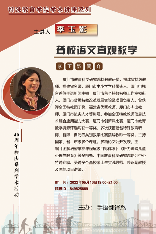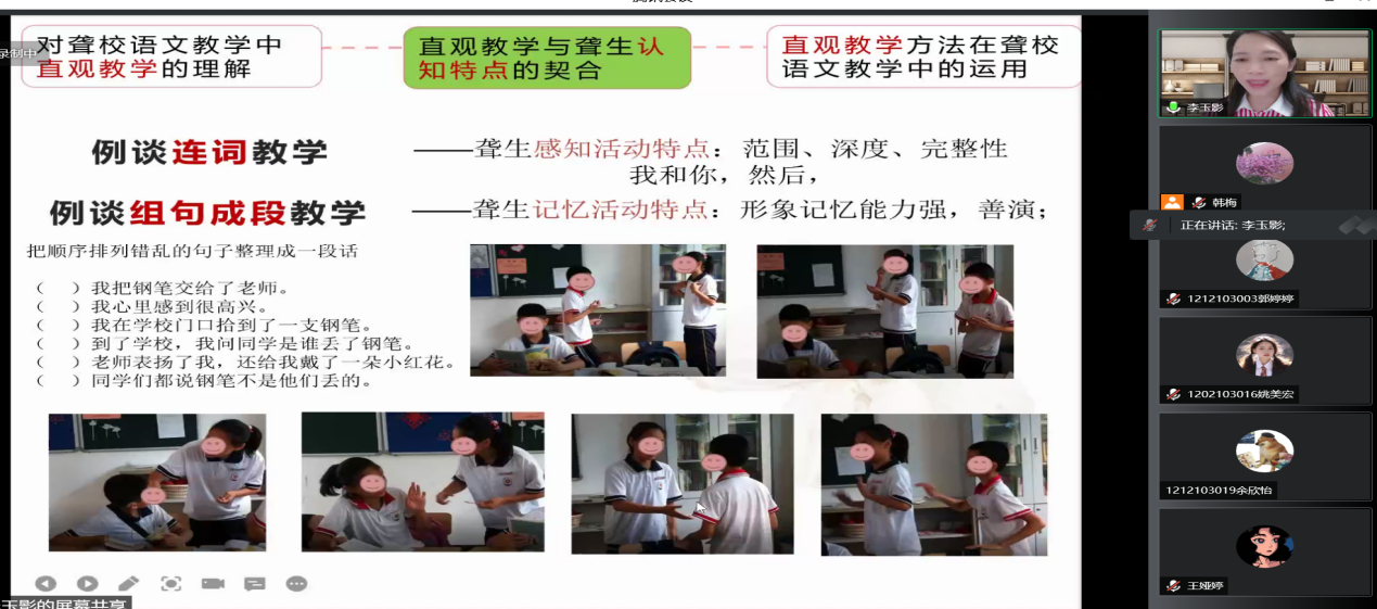 2022年5月16日,永利yl23411集团手语翻译系邀请厦门市特殊教育研究院特教教研员、福建省特级教师李玉影老师为特殊教育专业和手语翻译专业学生开展题为《聋校语文直观教学》的讲座。李老师结合聋生心理特点,通过丰富真实的课堂教学实例,介绍了如何在聋校语文课程中开展直观教学法。李老师的讲座由浅入深,通过一个个翔实的案例,让学生了解了怎样实施直观教学法。本次讲座是我校40周年校庆系列学术活动之一,永利yl23411集团手语翻译专业学生和特殊教育专业听障教育方向的学生参与了本次活动。(文/图 韩梅 编辑/徐琴 审核/李拉)