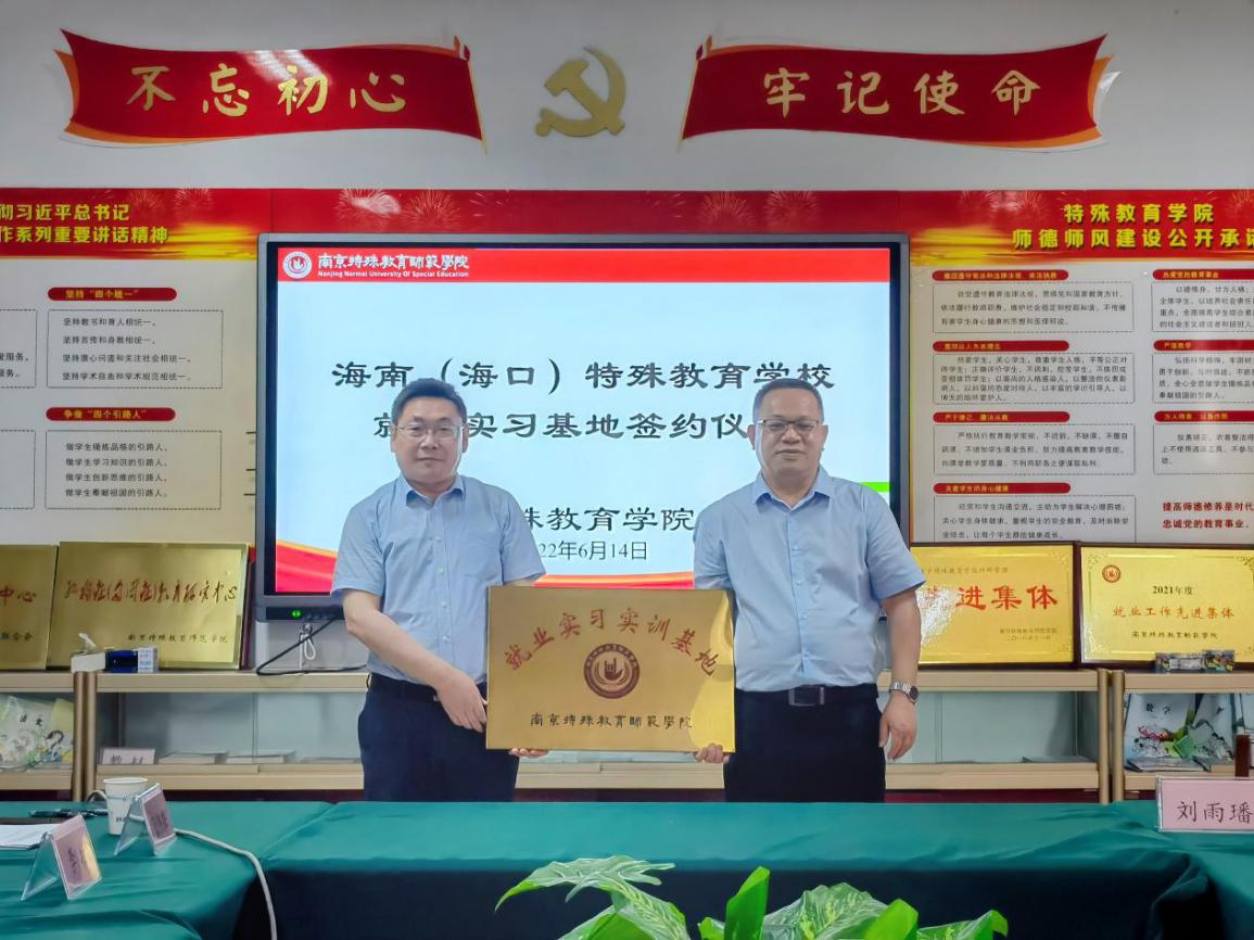 随后,我校教务处李贵希副处长海口特校教务处黄兴才主任共同签署合作协议,陈校长为海口特校授予“就业实习实训基地”铜牌。