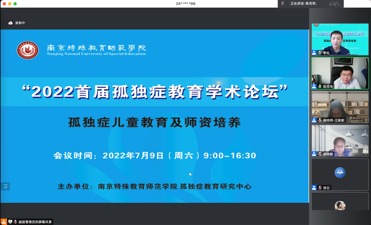 2022年7月9日,我校孤独症教育研究中心成功举办了为期一天的“首届孤独症教育学术论坛”。本次论坛邀请了来自浙江工业大学、华东师范大学、北京师范大学、重庆师范大学、香港地区、美国的知名专家学者以及基层学校的校长与教科研负责人,共10余名国内外顶尖的孤独症教育领域专家,共聚云端,围绕孤独症儿童教育与师资培养的主题展开研讨。线上参会人员突破六百余人,反响热烈。