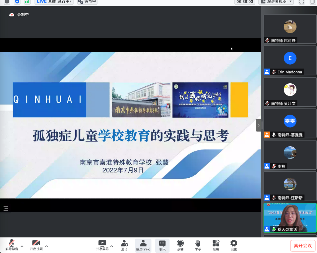 南京秦淮特殊教育学校的张慧校长从一线特殊教育学校的角度介绍孤独症儿童学校教育的实践探索与思考。孤独症教育师资的职后成长也是人才培养的关键环节,张慧校长的报告促使高等院校思考如何在建立满足一线学校需求的孤独症教育人才培养体系。