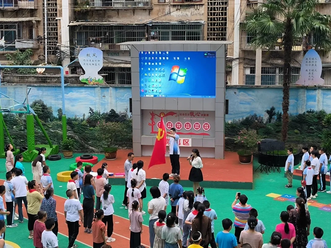 7月4日上午9点,队长吴瑞婷进入惠智学校六年级班级,并和班上7名同学一起参加了每周一的升旗仪式。