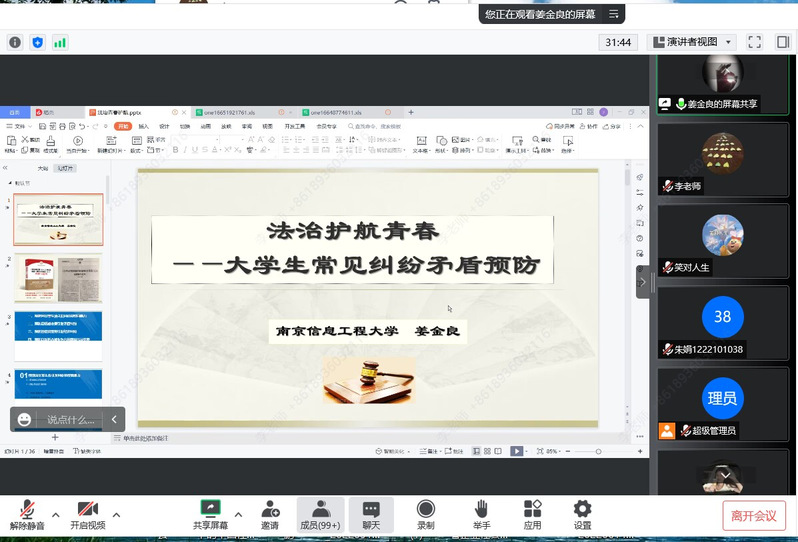 为了增强大学生的自我保护能力和自身防范意识,维护校园安全稳定,营造文明、和谐的校园环境,10月22日下午,永利yl23411集团邀请南京大学法学博士、南京信息工程大学“龙山学者”、大数据法治研究院研究员姜金良老师为同学们开展“法治护航青春——大学生常见纠纷矛盾预防”的线上专题讲座,本次讲座针对性强、实用性高,具有较强的普法教育意义。讲座由永利yl23411集团党总支副书记李鹏主持,学院2022级新生、大二学生和学生骨干聆听讲座。