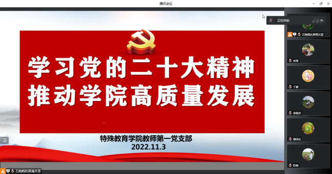 在学习心得交流环节,陈琳表示要把学习党的二十大报告所汲取的精神力量转化为工作的动力,坚守特教人的初心和使命,为特殊群体服务,以特殊教育事业的高质量发展助力教育强国的早日实现;徐琴认为,学习贯彻党的二十大精神,要努力在学懂弄通做实上狠下功夫,认真谋划本岗位的工作,履职尽责,全心全意为老师和学生服务;李晓庆表示,通过学习党的二十大精神,更加坚定了以习近平新时代中国特色社会主义思想武装头脑的信念。在今后的工作中,既要传授好专业知识,更要以自身的道德行为和魅力言传身教,引导学生实现人生应有的价值追求,真正做到“教书育人”;李晓娟认为,党的二十大报告中,习近平总书记关于“四个始终”的精炼总结,为我们指明了前路。作为教师,既要创新教育模式,顺应时代的变迁,又要使教育回归本真,不忘育人初心。既要结合自身工作岗位,又要立足学校发展蓝图,一丝不苟做好自己的事情;石晓辉指出,无论是社会主义现代化强国的全面建成,还是办人民满意的南特大新征程,都需要我们每一位党员坚决拥护党中央的坚强领导,承担起并落实好新时代赋予的责任与担当。在前进的过程中,我们要坚定理想信念,坚持实干担当,始终改革创新。