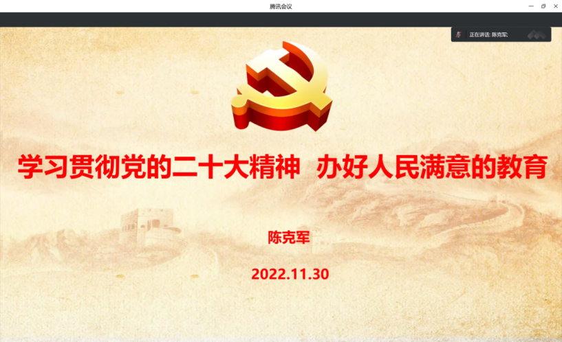 为进一步学习宣传贯彻党的二十大精神,11月30日,校党委常委、副校长陈克军以“学习贯彻党的二十大精神 办好人民满意的教育”为主题,给我院师生上专题党课。永利yl23411集团全体教职工和学生党员参加党课学习。