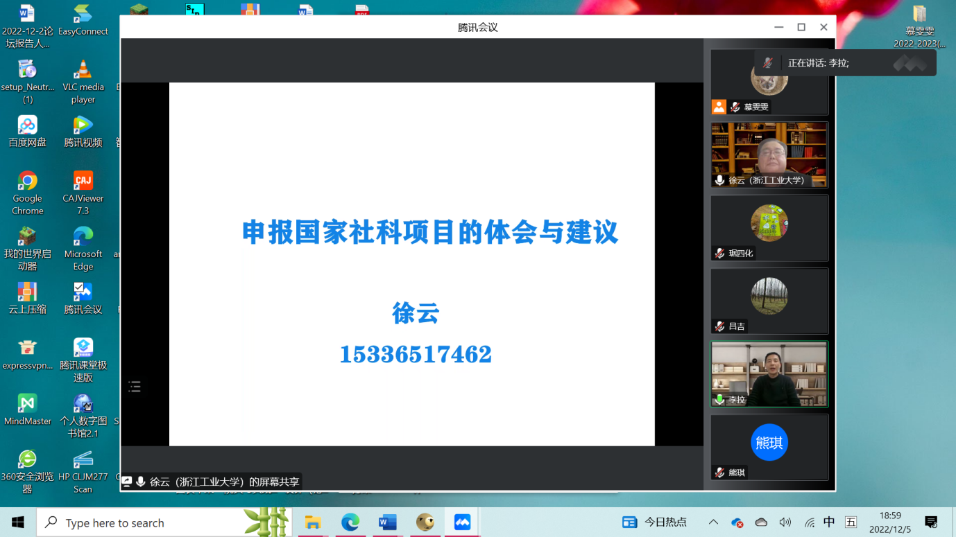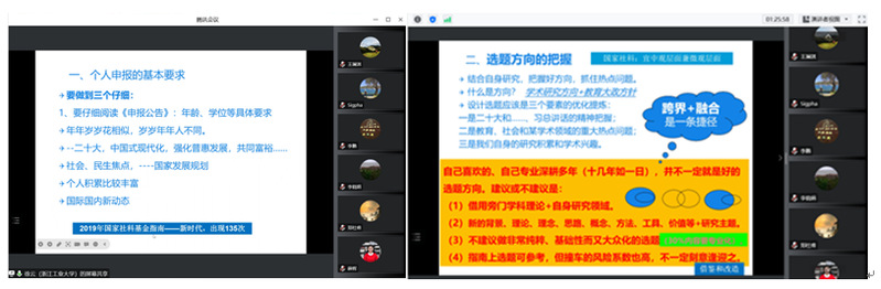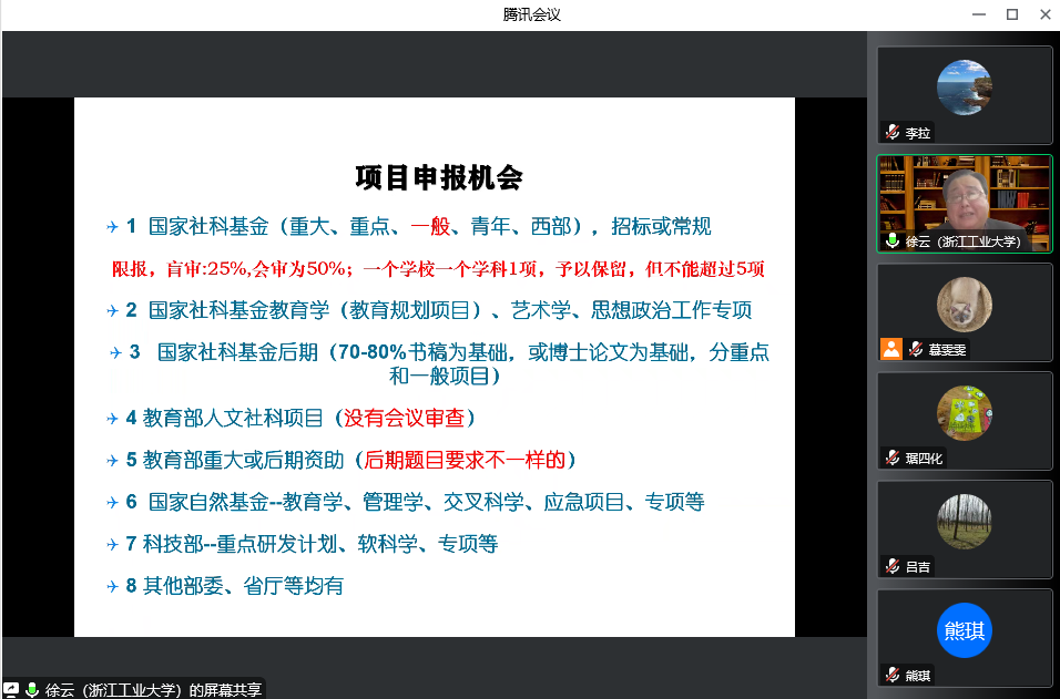 为响应我校关于做好2023年度国家级、教育部科研项目预申报的工作要求,根据永利yl23411集团《2023年度国家级、教育部科研项目申报工作推进方案》,为了有序推进申报工作,切实提升我院国家级、教育部科研项目的申报质量、提高立项通过率,2022年12月5日晚,通过腾讯会议,永利yl23411集团邀请我校特聘教授徐云教授为今年永利yl23411集团参与国家级项目预申报的11位老师进行远程辅导,永利yl23411集团院长李拉教授主持了本次活动。