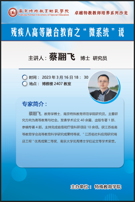 为深入贯彻落实卓越特殊教育教师培养计划,深化学生对于高等融合教育的认识,永利yl23411集团于20233161830在博雅楼2407开展卓越教师培养系列沙龙。本次活动有幸邀请到蔡翮飞研究员,做题为《残疾人高等融合教育之“微系统”说》的学术分享。活动由20级卓越班卢怡萍主持,永利yl23411集团20级和21级特殊教育专业同学参加。