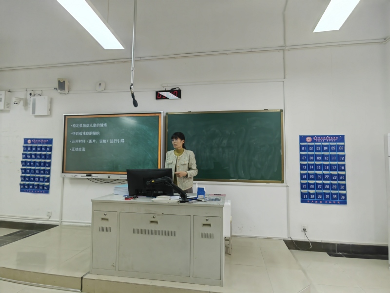 开篇,李晓庆老师向同学们介绍了五类孤独症儿童的特点和表现。接下来,李老师穿插实际案例介绍了孤独症儿童沟通的特点,继而阐述了孤独症儿童在沟通中表现出刻板、焦虑、强迫等行为的原因。最后,李老师总结多年实践经验,结合三个案例教授了四种与孤独症儿童沟通的方法。李老师指出特殊教育是一件非常有意义的事情,但是需要专业。李老师不仅给同学们示范了培智学校“10-2”的教学过程,还给同学们未来专业发展提出了宝贵的建议。