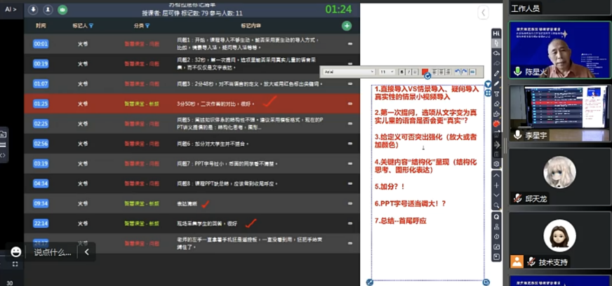 陈星火教授从“新颖”“建议”出发对课例进行专业点评,他表示本堂课利用信息化手段,二次作答技术的使用让课堂教学效果突出,通过录音采集学生的回答设计也很新颖,给人眼前一亮的感觉。并在课程导入、知识体系阐述、教学课件设计方面提出中肯建议。