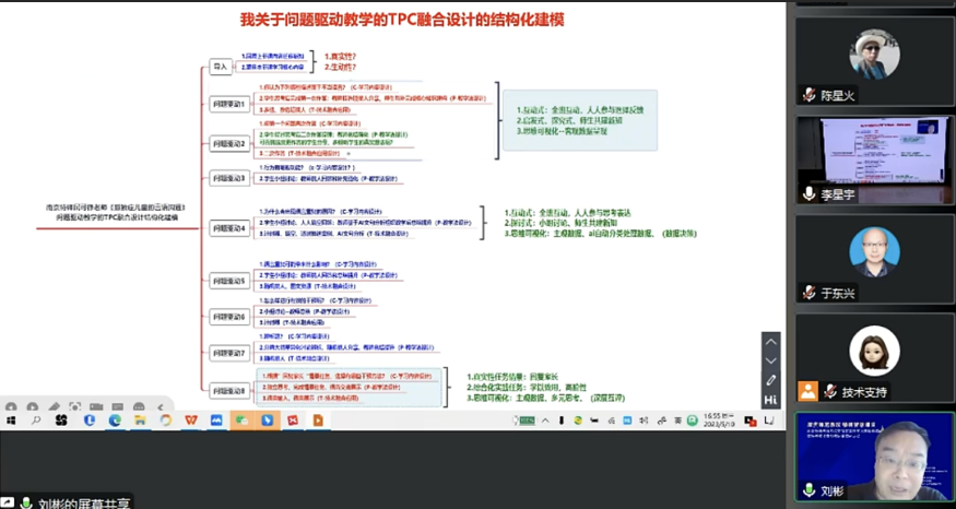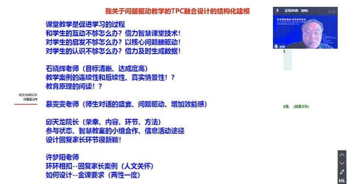 刘彬教授结合本堂课的教研数据分享《学校问题驱动教学的TPC融合设计》。他指出课堂教学是金课的主阵地,师范高校的教改要从讲授式教学转变为真实性情景式学习,同时,高校打造金课要有“两性一度”(高阶性、创新性、挑战度)的标准。他结合三位专家的点评建议,生成TPC融合结构化模型,对本次活动具有参考意义。
