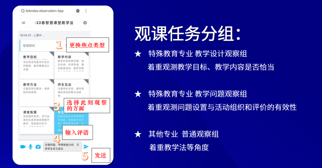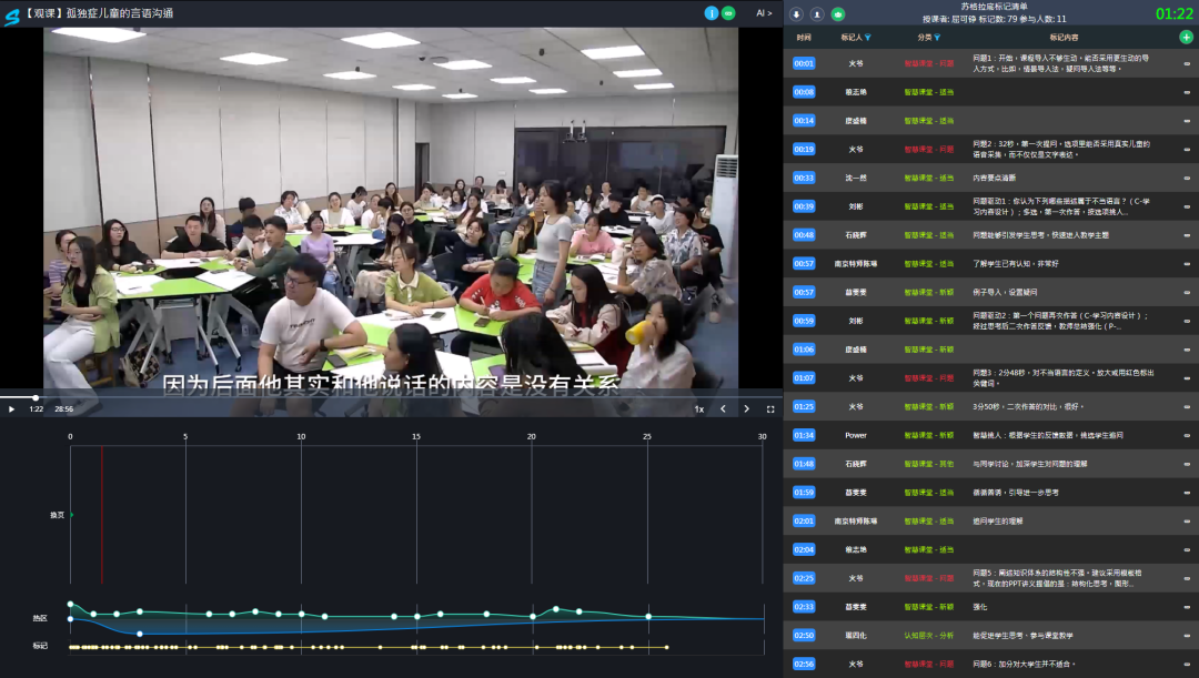 本次活动以“智慧教研”为中心,主持人带领大家一起观摩永利yl23411集团屈可铮老师的智慧课例《孤独症儿童社会性发展与教育》,线上线下观摩专家、老师通过扫码进行同步打点标记。在苏格拉底议课APP上,可以更换焦点类型,选择点评方向,将教学过程中的重难点、建议点、教学设计新颖点通过文字、拍照等方式进行记录。