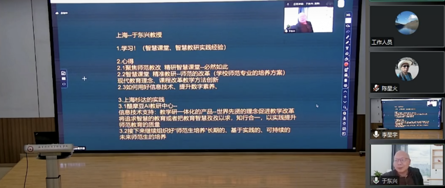 于东兴教授围绕“师范教改”进行线上点评,他提出利用人工智能创新教学教研方式,对师范教改有重要意义,希望以“师范生培养”为目标,连接更多智慧大学形成长期的,基于实践的,可持续的联盟组织。