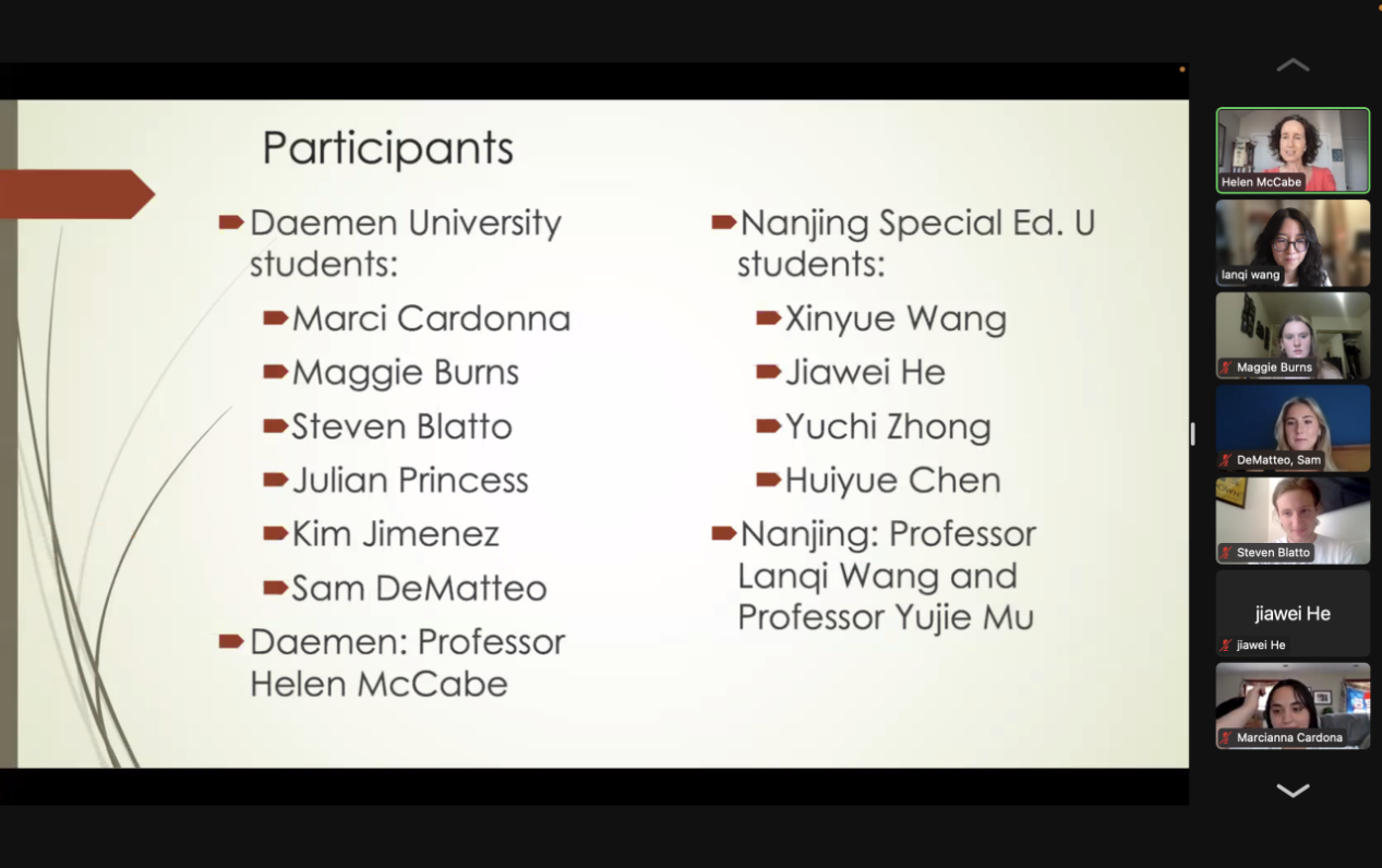 2023年5月12日20:30,一场跨越空间的中美特殊教育学术沙龙在yl23411集团特殊教育系师生们的精心组织下顺利进行。参会美方成员有德门大学Helen Matteo教授,六名该校特殊教育专业学生,中方成员有我校牟玉杰老师、王澜淇老师、永利yl23411集团20级卓越班同学何佳蔚、王馨悦,21级卓越班同学钟逸驰、陈慧玥同学。