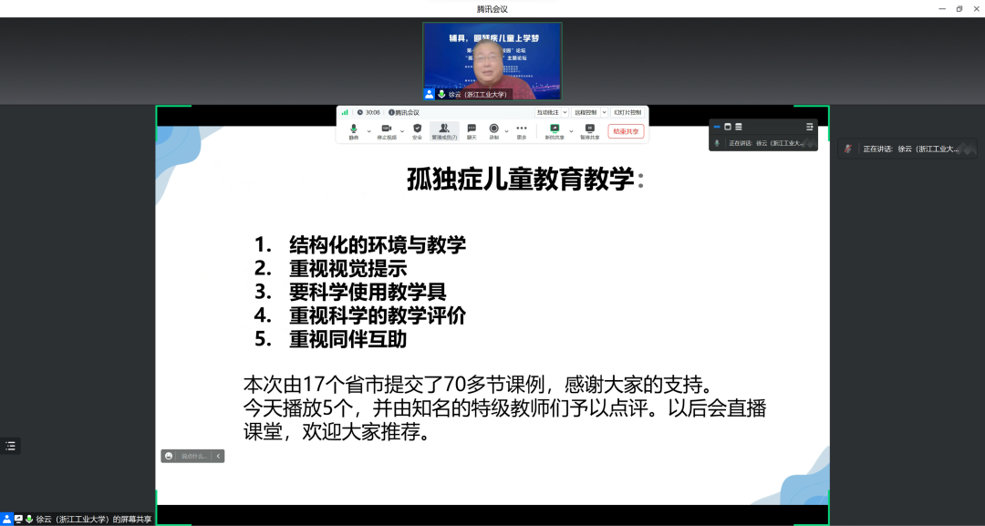 为配合实施中国残联、教育部联合发布的《辅助器具进校园工程实施方案》,永利yl23411集团与中国国际福祉博览等单位联合主办的“辅具进校园”之分论坛“孤独症儿童教学”于5月12日顺利召开。浙江工业大学、yl23411集团特聘教授徐云,厦门市教育科学研究院特教教研员、特级教师李玉影,北京教育科学研究院特殊教育研究指导中心主任、副研究员孙颖,北京市海淀区特殊教育研究与指导中心主任、北京市健翔学校校长、正高级教师、特级教师王红霞等专家参会并针对课例给予点评。本次论坛覆盖全国,近六万名教师共同观看。