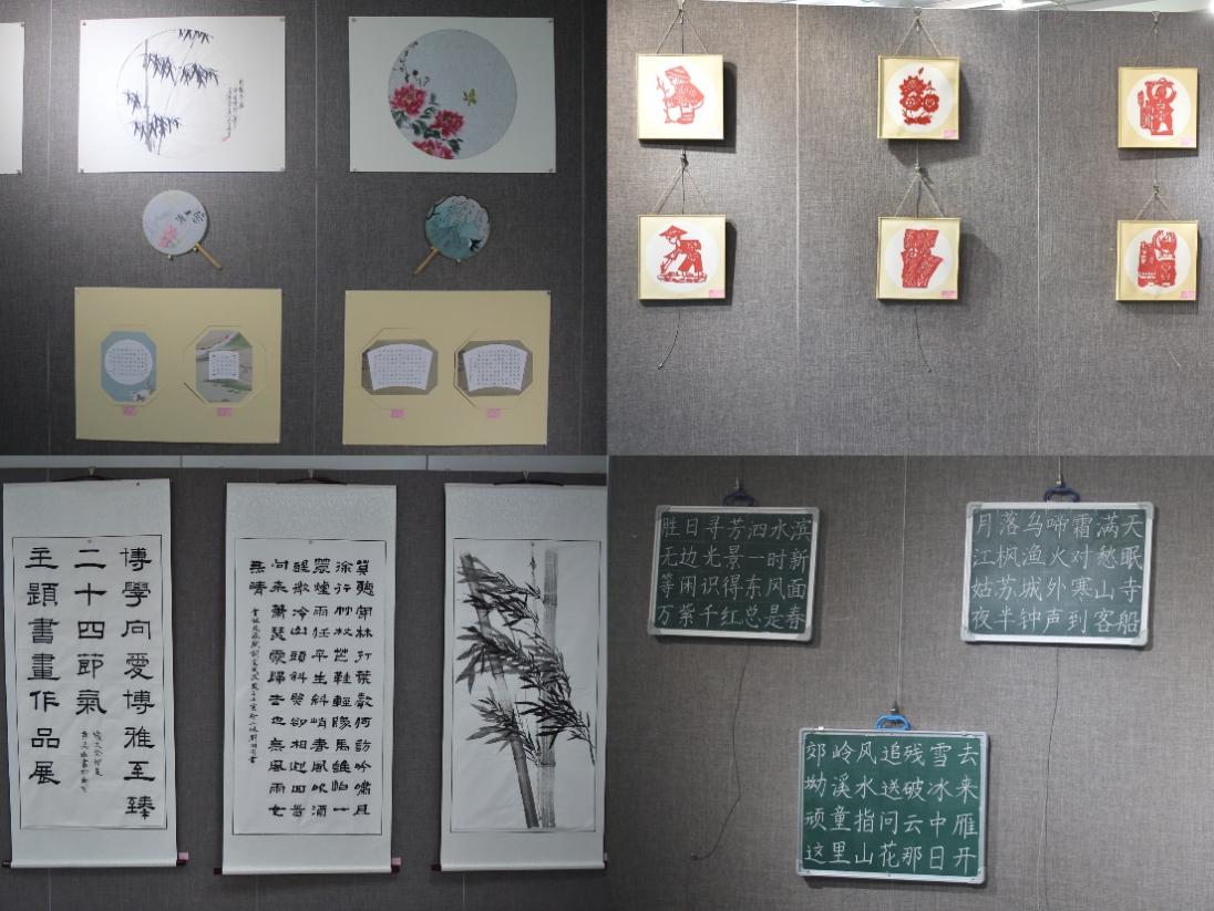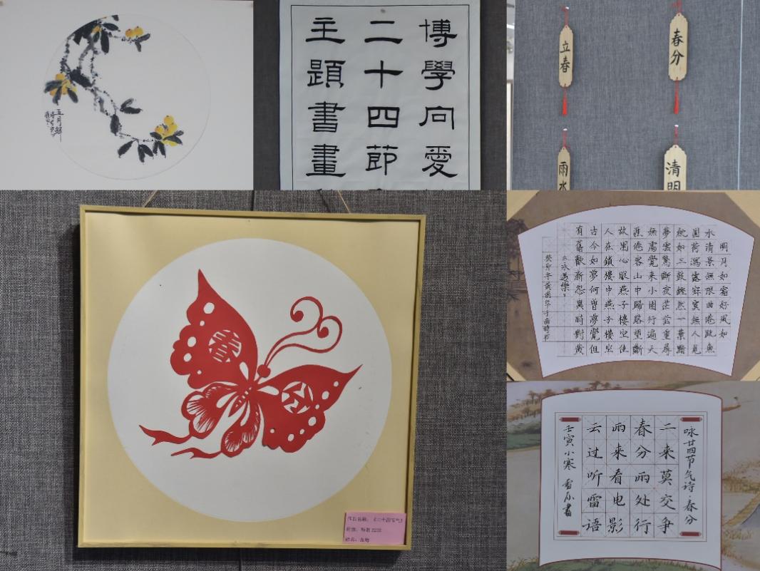 二十四节气主题书画作品展包含钢笔字、国画、简笔画、粉笔字、蒲扇文创、剪纸七种元素,同时融入了旗袍、古筝、古琴等传统元素。剪纸是中国传统民间艺术之一,是世界的艺术瑰宝,它犹如一株常春藤,古老而长青,具有深厚的文化底蕴。将精细的剪纸与二十四节气相融合,同时也是中国文化的相互渗透,生动地表现出节气中的生活规律和乐趣。