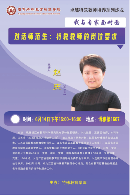 为进一步使同学们了解如何做好一名特教教师,特教教师有哪些岗位要求,永利yl23411集团于2023年6月14日15:00在博雅楼1607开展卓越特教教师培养沙龙。