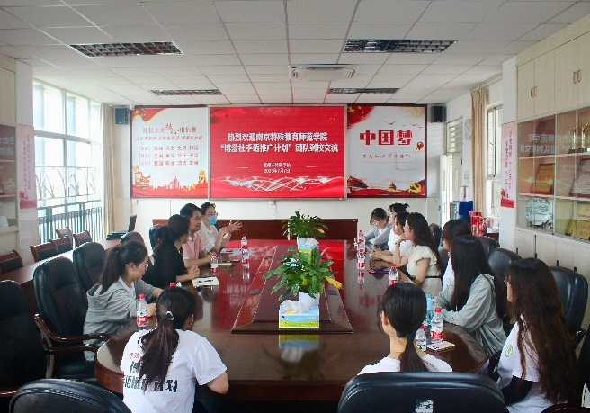 结束参观会,团队成员们在学校党建工作室开展了活动的启动仪式。首先,李校长对我们团队的到访表示欢迎,然后他从办学概况、办学目标及办学成就、师资骨干等进行了详细介绍,表示学校“一切发展为了残障学生的未来”,未来也将持续高质量推进惠州市特殊教育发展。随后,双方进行了授牌仪式。仪式结束后便开始了紧锣密鼓的手语学习。惠州特校为我们提供了非常充分的老师资源,包括还邀请了3名聋人毕业生为我们指导地方特色手语。两天的学习,同学们完成了惠州市地方手语词汇和故事集,也录制了相关视频,同学们之间相互配合,进展顺利,体现了我院学生的专业素养。