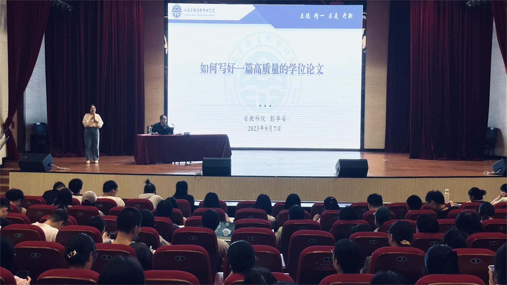 为规范毕业论文的撰写,提高毕业论文的写作质量,永利yl23411集团于2023年9月7日下午1点30分在实训楼报告厅开展了主题为“如何写好一篇高质量的学位论文”的讲座,作为2024届毕业论文指导系列讲座第一场。此次讲座特邀江苏省教育科学研究院彭华安研究员担任主讲人,出席讲座的有永利yl23411集团院长李拉、陈苏婉老师和韩晓庆老师,以及2024届全体毕业生。
