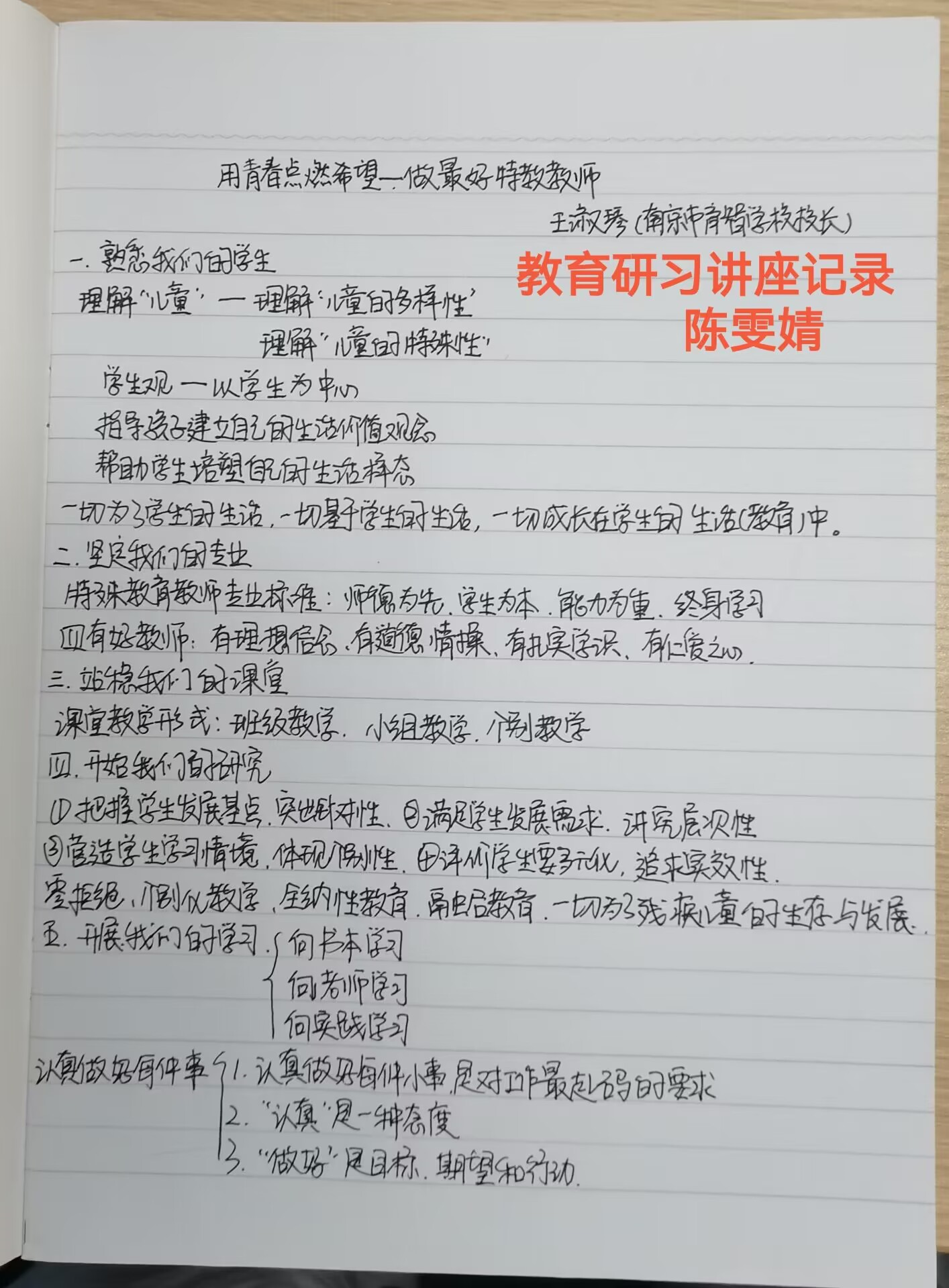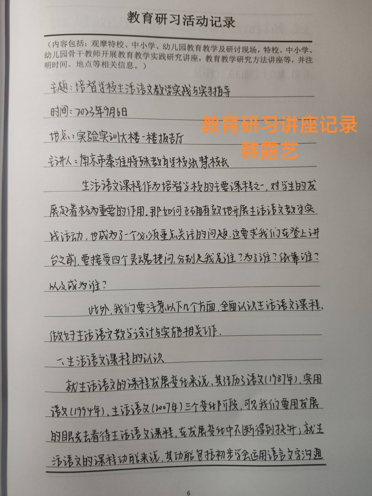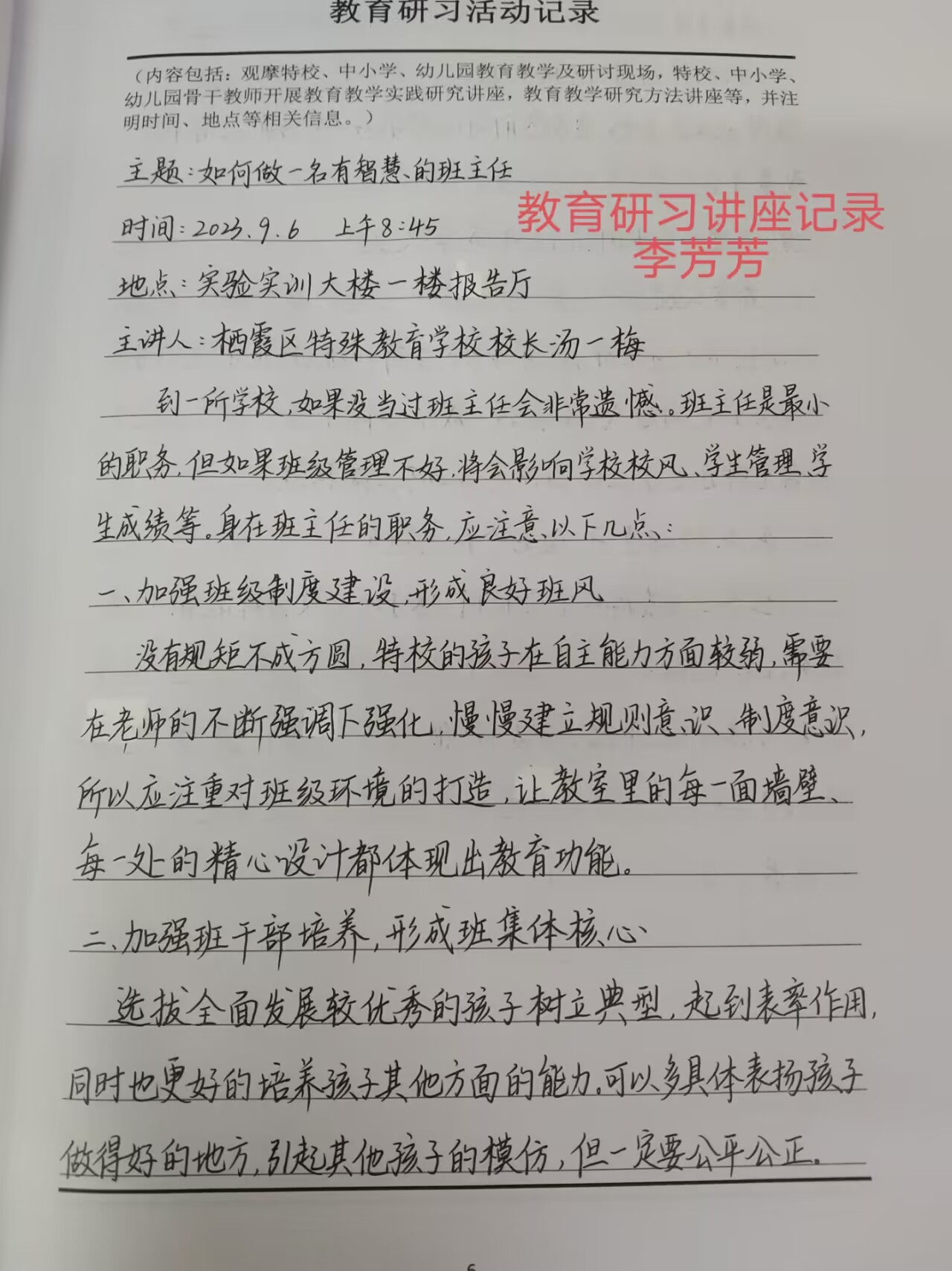 开展实习指导讲座。研习期间,南京市育智学校校长王淑琴、秦淮特殊教育学校校长张慧、栖霞区特殊教育学校校长汤一梅、游语影子教师项目创始人戴玉蓉等分别为2024届毕业生开展实习指导系列讲座,从特教教师职责与担当、培智学校生活语文教学实践、班级管理、融合教育创新实践等四个方面为同学们指点迷津、答疑解惑,辅导同学们更好地适用从师范生到实习教师的角色转变。同学们听课积极性高,认真做笔记,收获满满。根据学院研习工作方案要求,同学们结束后撰写实习讲座学习体会,整理好听讲笔记。