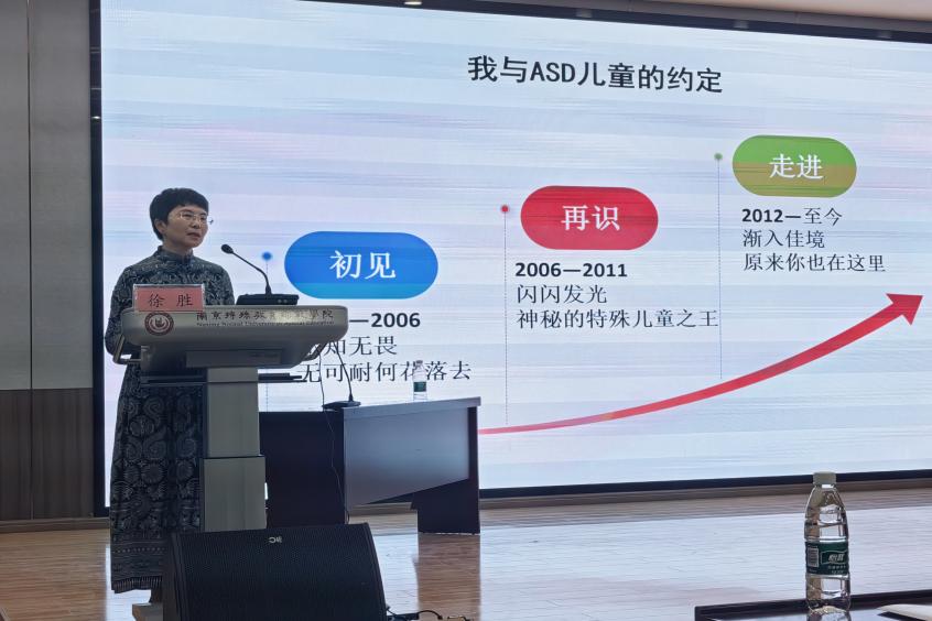 徐胜教授做题为“我与孤独症儿童有个约——记三十年专业成长的探索、实践与研究”的主旨报告。徐教授从自己三十年的工作历程谈起,分享了数位ASD儿童的经历,并提出了ASD儿童在经历从实践至教学再到研究这一过程所面临的困境及相应解决途径,以及由此引发的对ASD儿童师资培养的思考与展望。